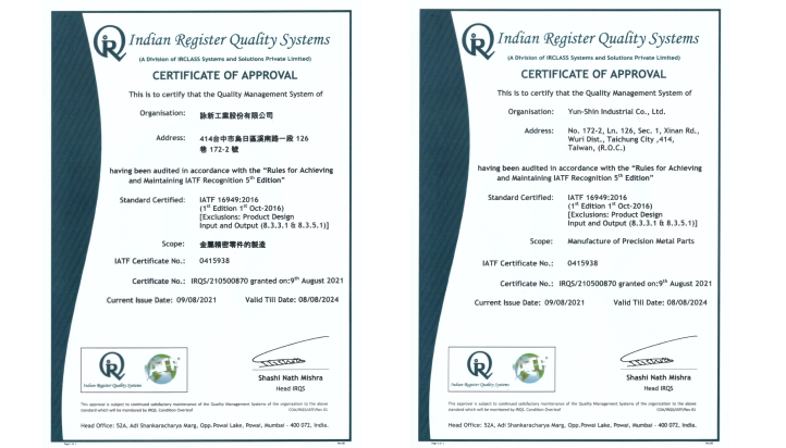 詠新工業成立迄今在CNC加工製造/五金零件產品加工/汽、機車曲軸零件領域裡的資深經歷與服務成果一直是客戶滿意信心來源,我們正更努力締造中小企業創業成功的典範。為了符合世界上對品質管理的潮流與要求,我們毅然導入 IATF 16949:2016 品質管理系統標準來建立詠新的品質管理系統,期望系統標準化的管理能健全制度、提昇快速服務品質水準,更能提供滿足客戶需求的最佳選擇。